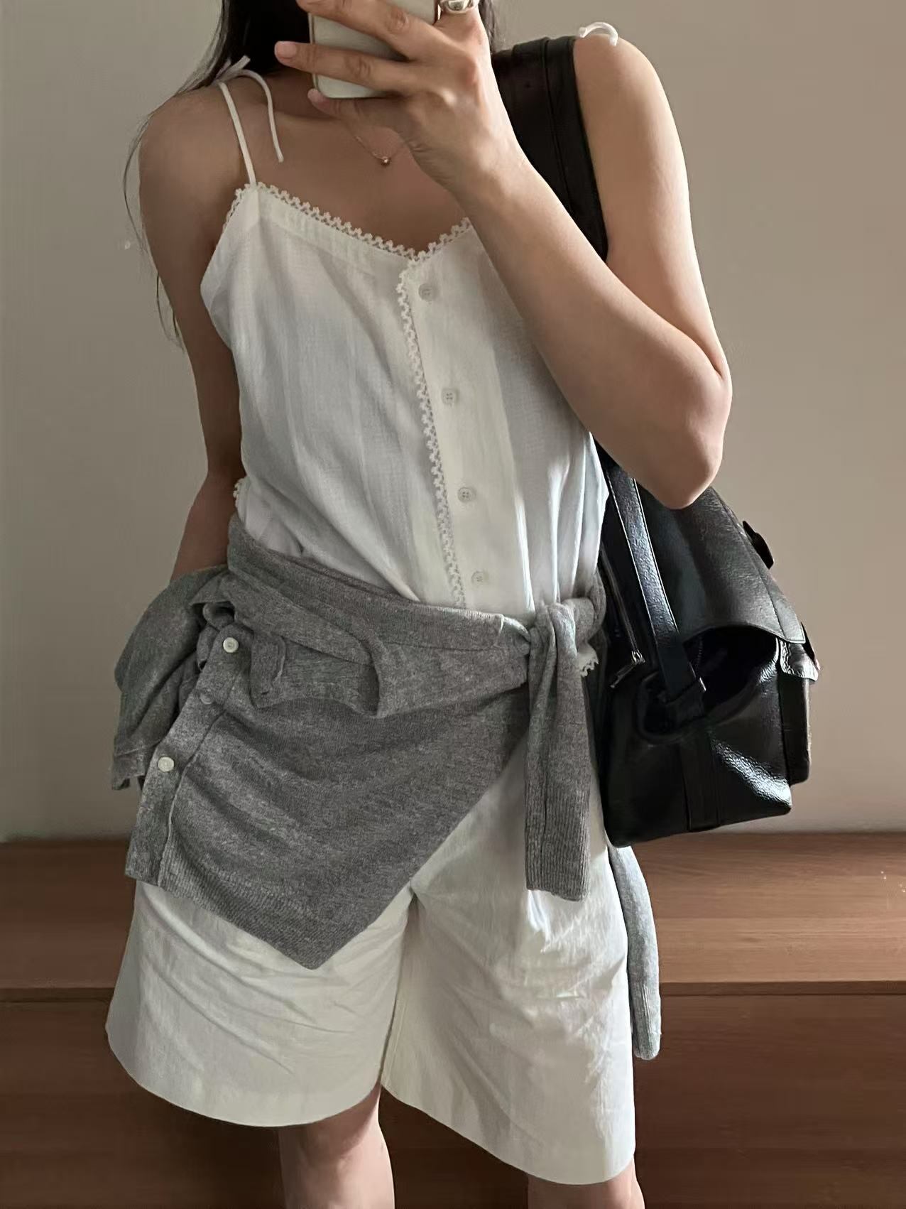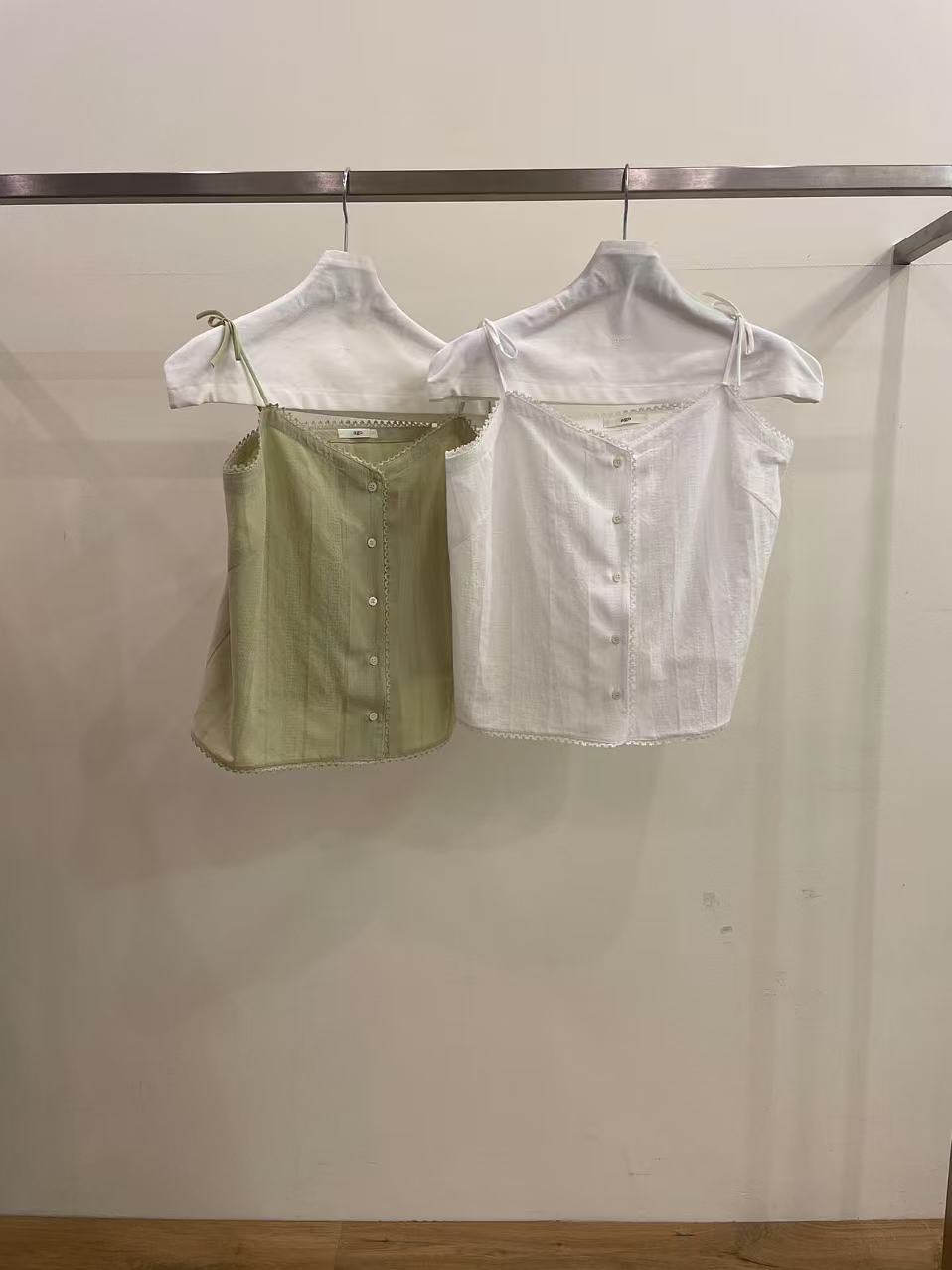V-neck camisole with charming button details at the front. Simple yet sweet, with a touch of playful elegance.