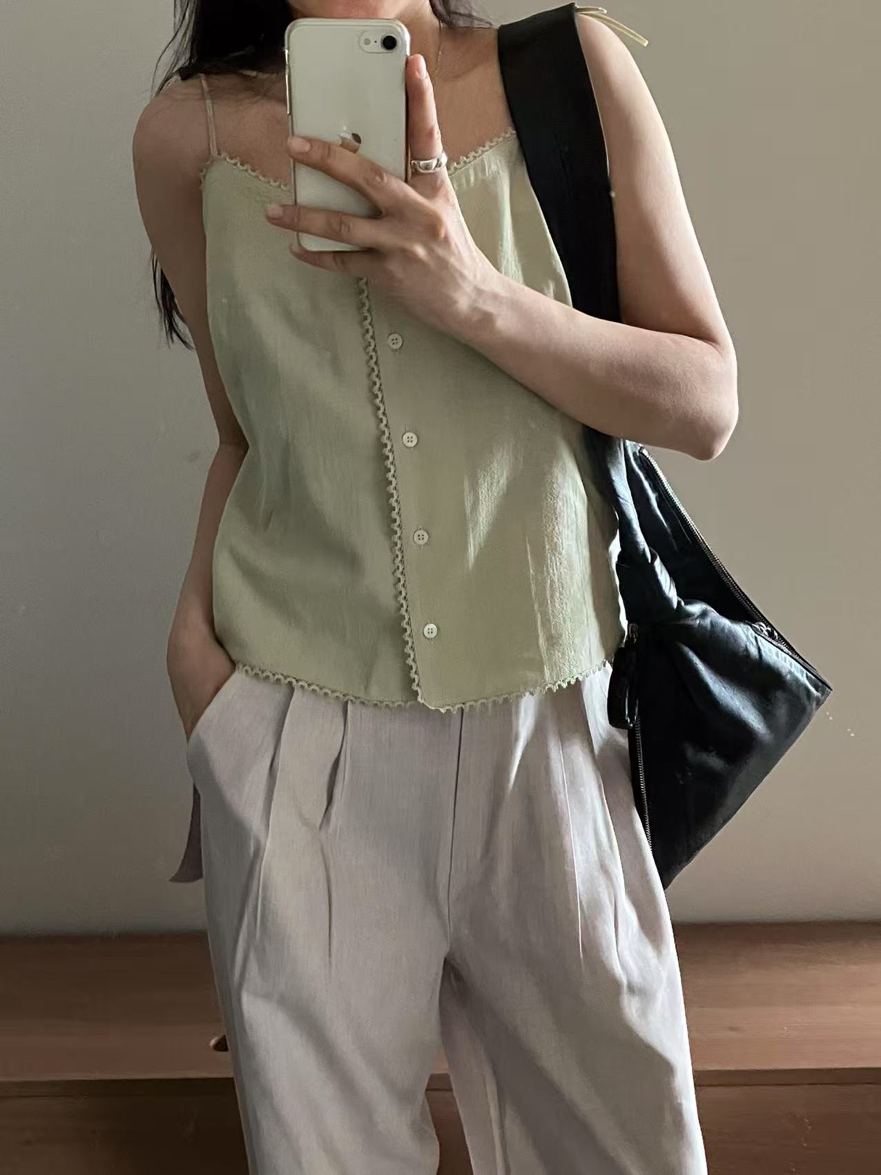 Vネックのキャミソールに、フロントのボタンがさりげない可愛さをプラス。シンプルながらも遊び心のある一枚です。