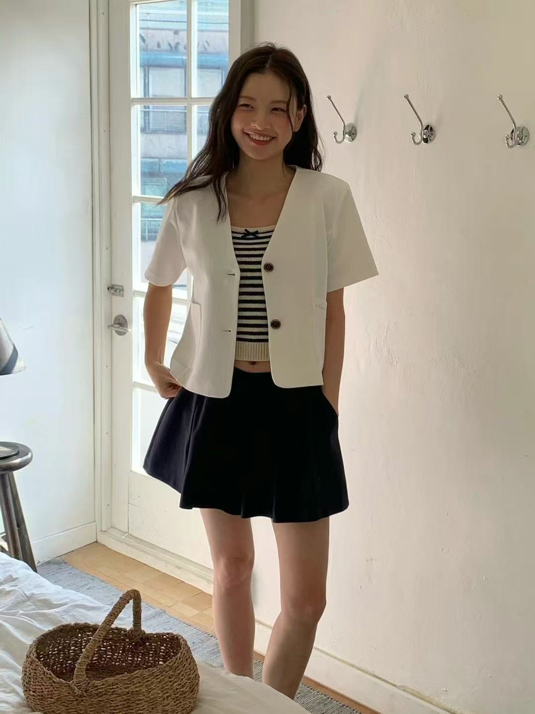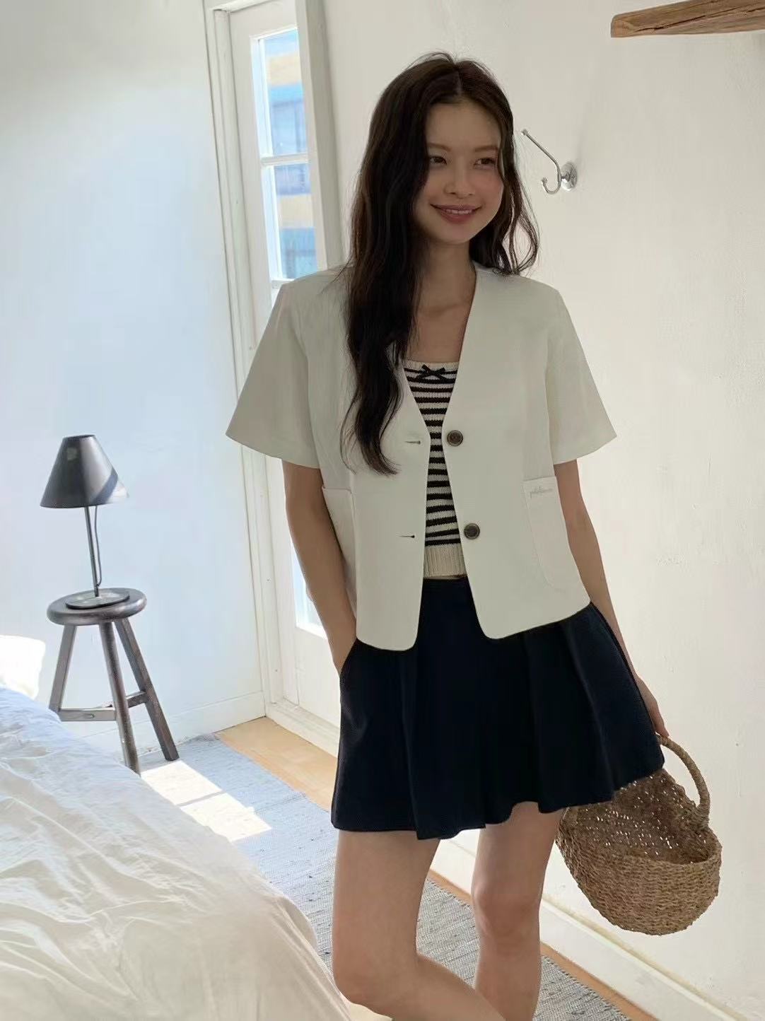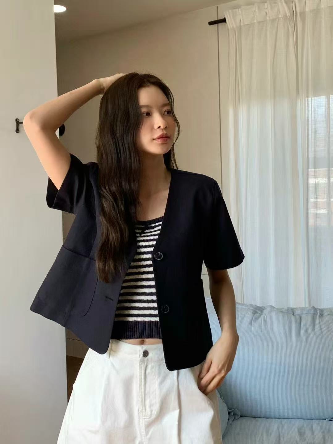 A short-sleeved V-neck jacket with a clean silhouette and light structure. Its cropped length adds clarity to layered looks, offering balance without excess.