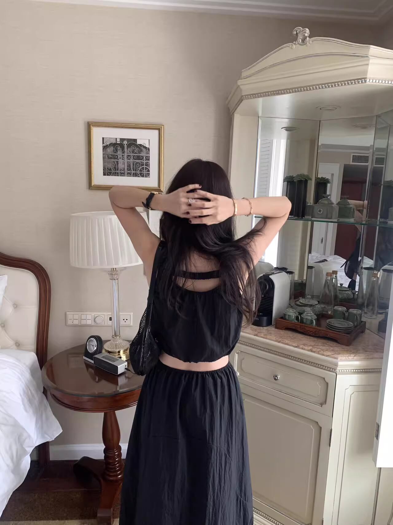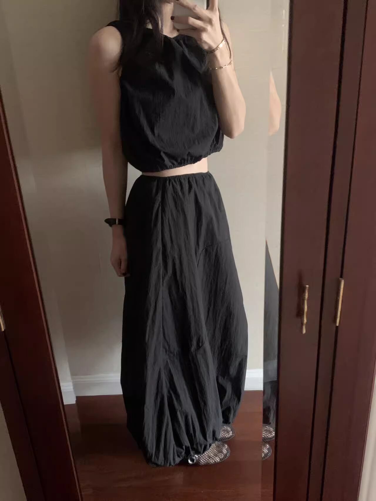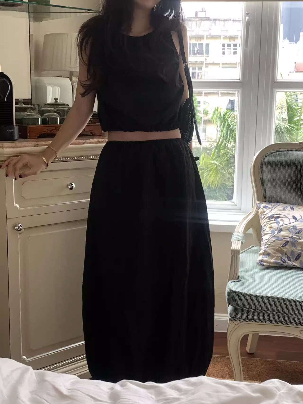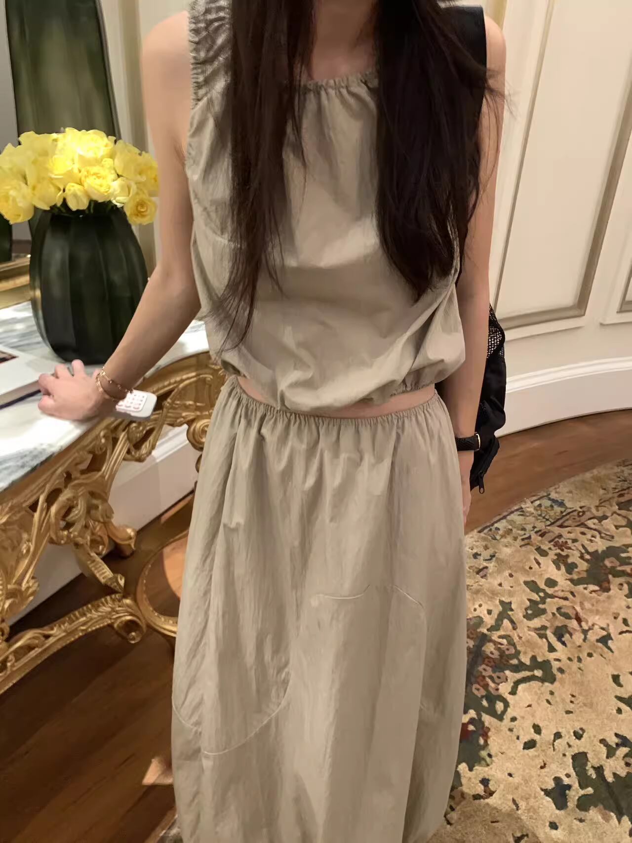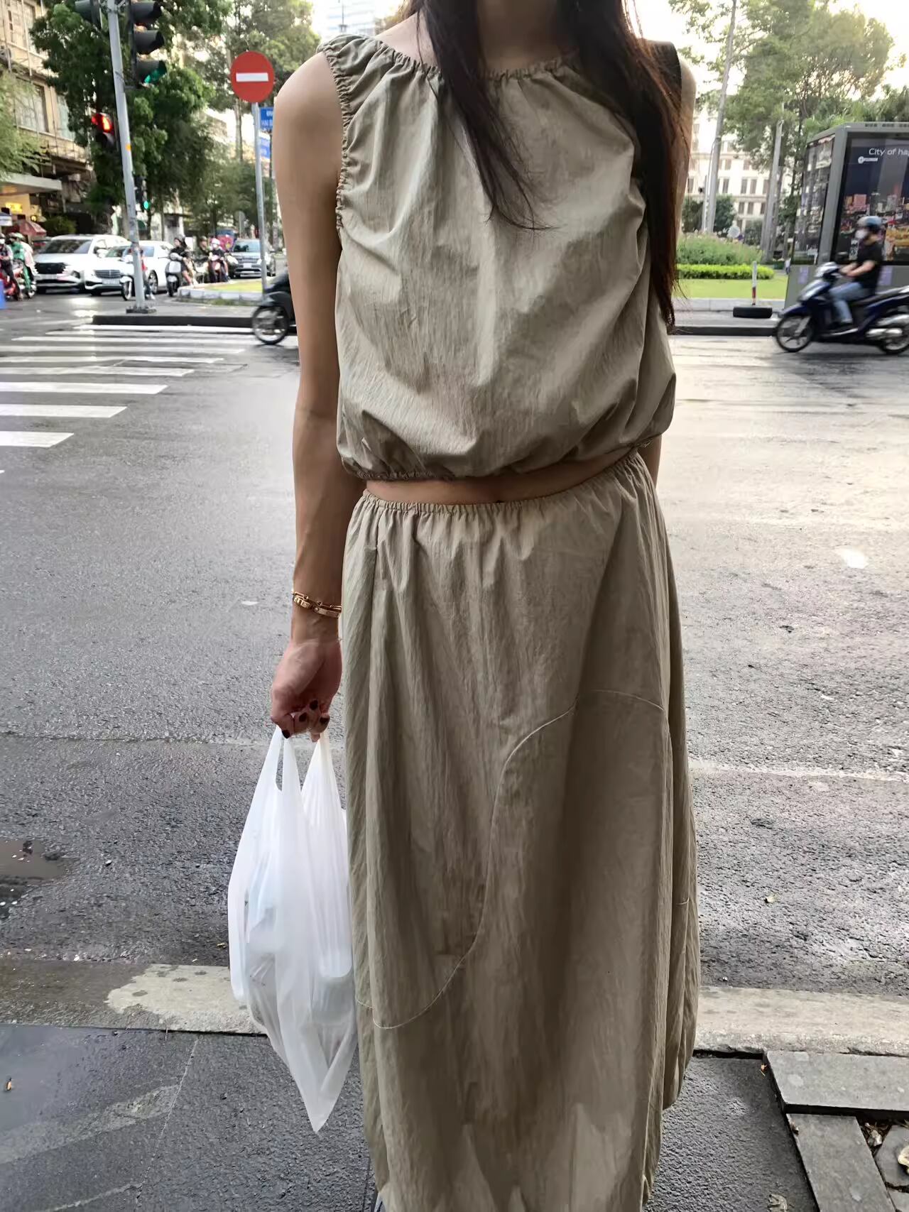 A refined sleeveless top from a two-piece ensemble, designed to pair effortlessly with the matching long skirt. Graceful lines and minimalist tailoring highlight its quiet elegance, perfect for both casual and sophisticated styling.