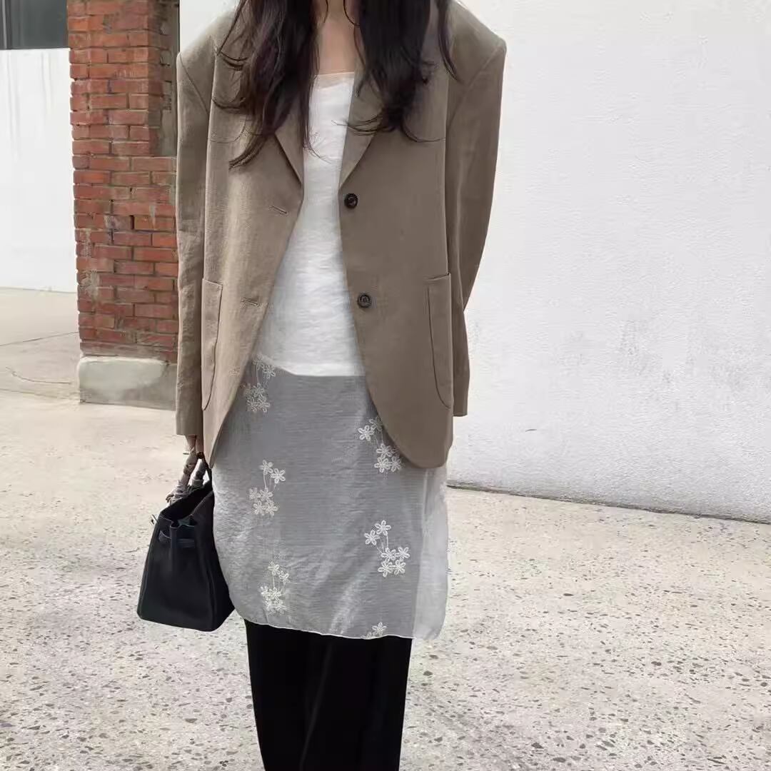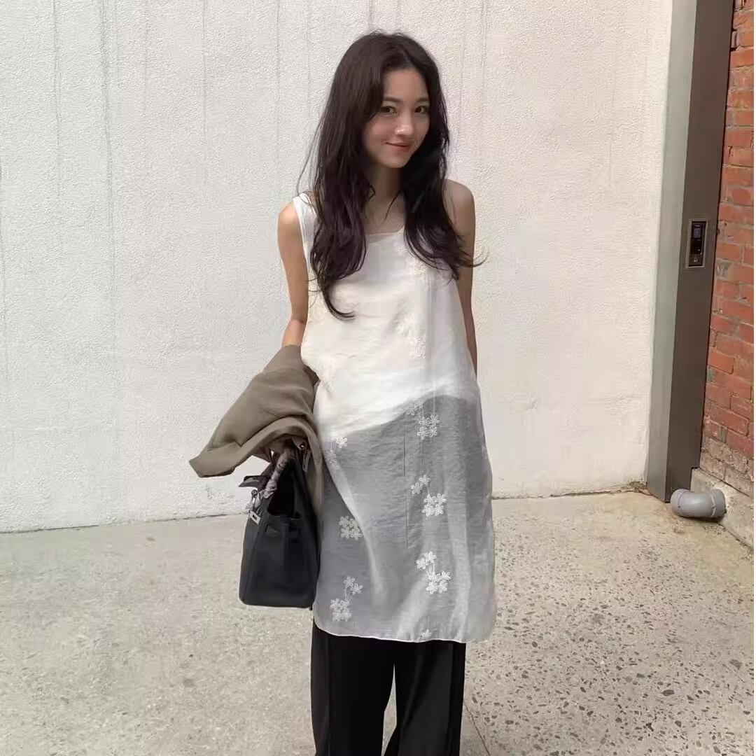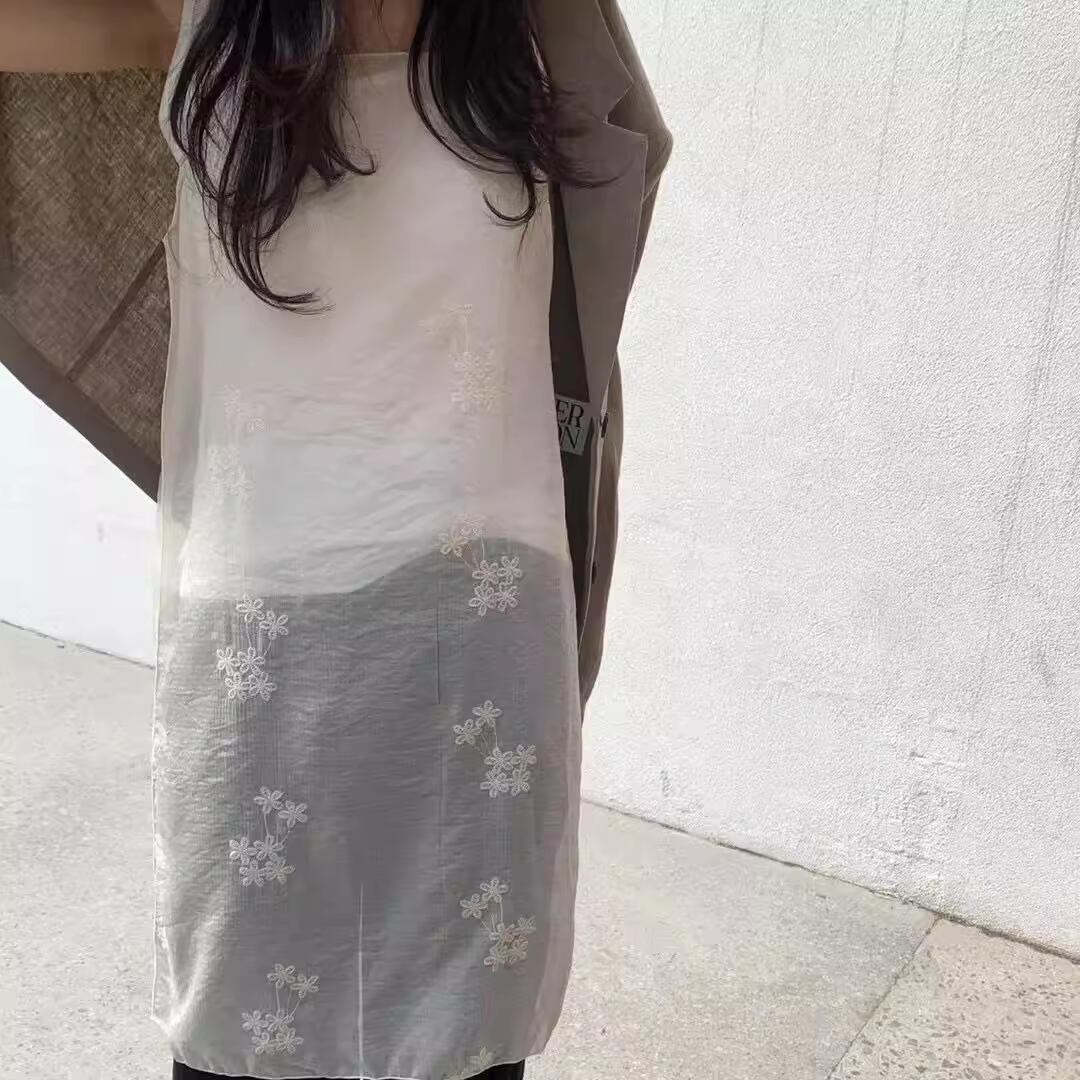 A camisole-style cotton dress layered with an airy, sheer embroidered overlay. This piece blends simplicity with poetic detail, evoking a quiet elegance like a soft veil over sunlight—perfect for effortless layering and refined daily wear.