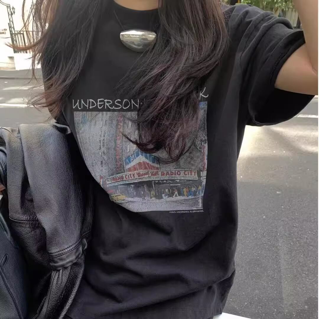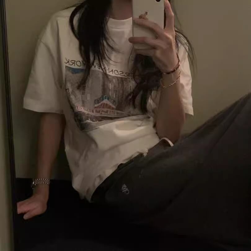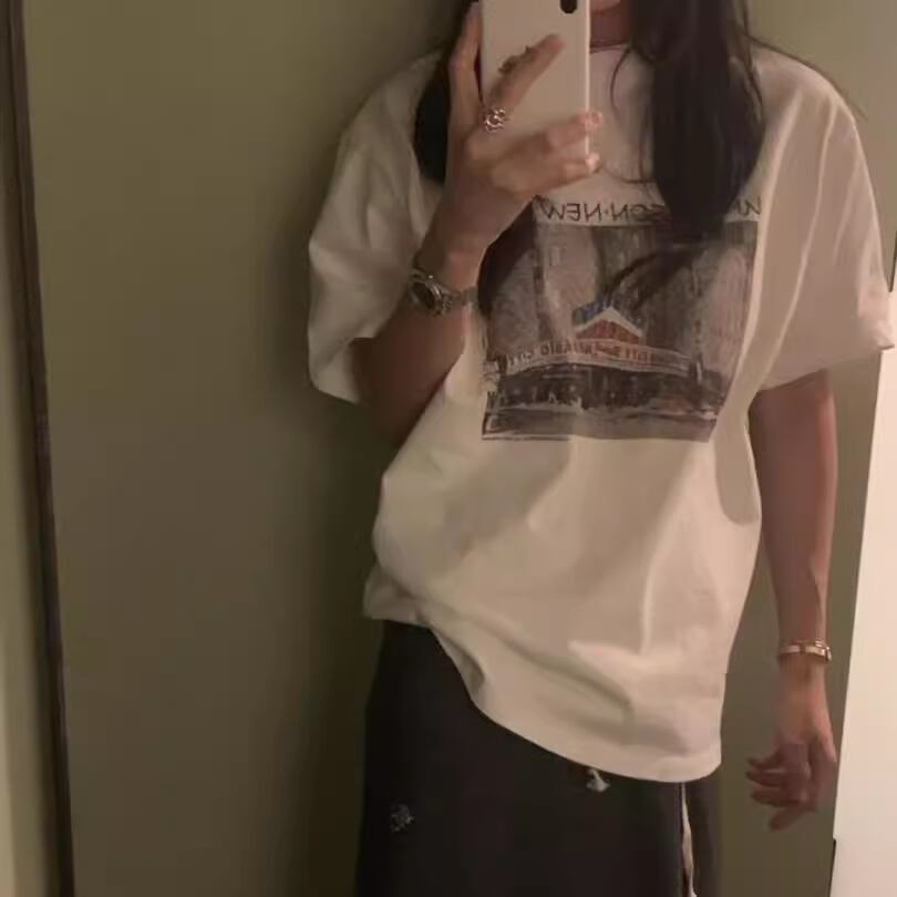 綿100%のオーバーサイズTシャツ。穏やかな風景プリントが広がり、そよ風のような着心地で心を解きほぐします。