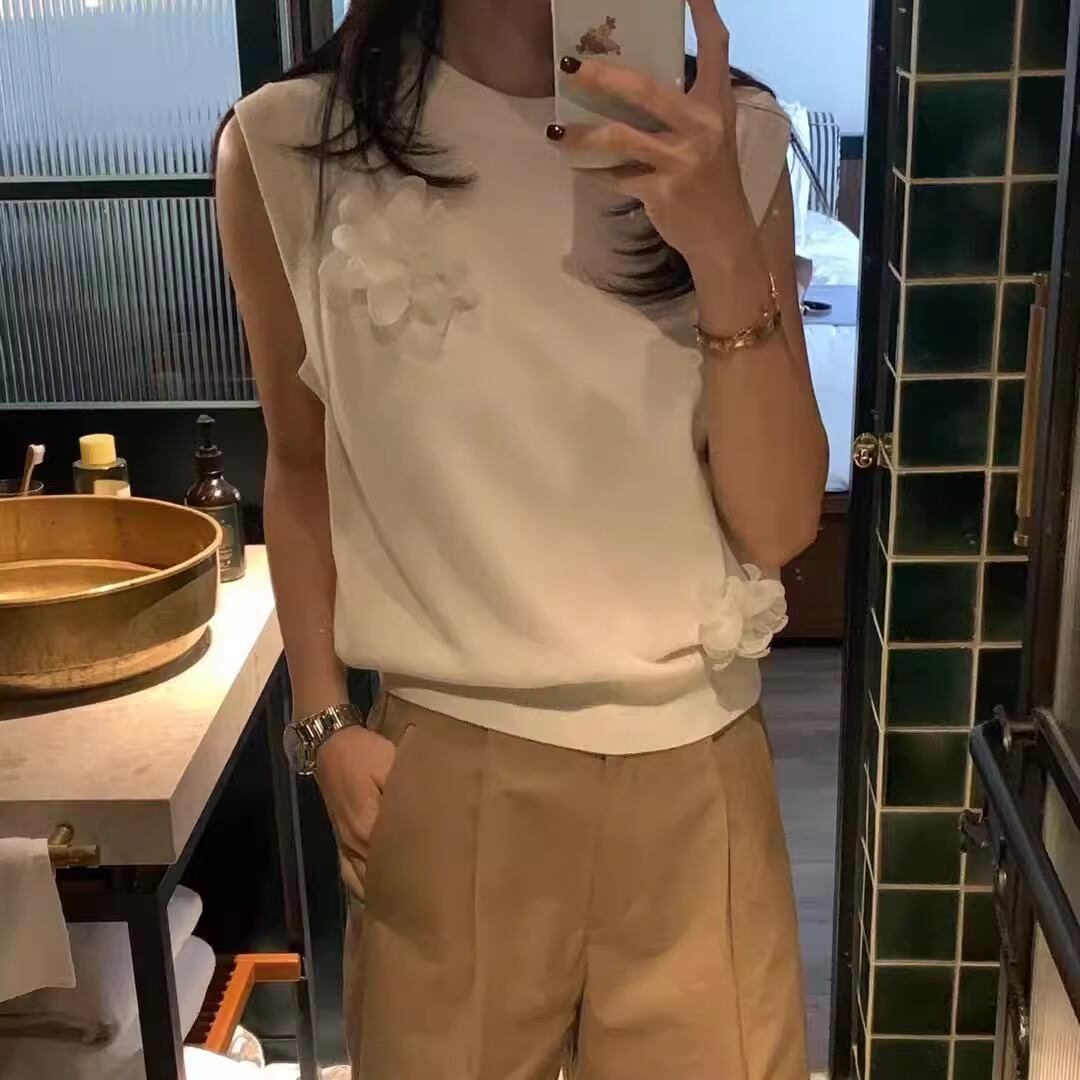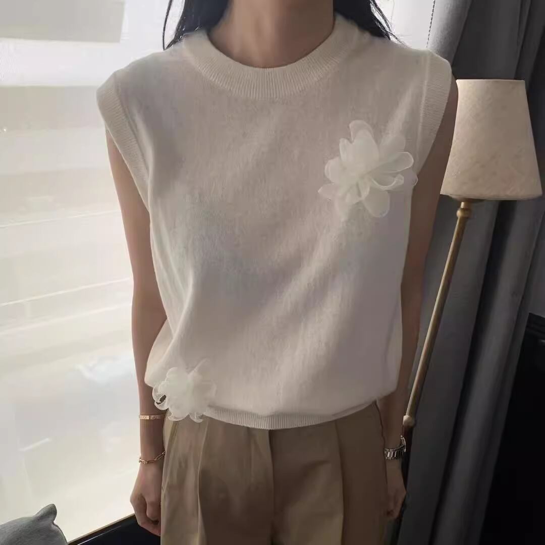 A lightweight cashmere vest adorned with a delicate camellia flower knit design. Perfect for the transition between spring and summer, offering both warmth and breathability with a soft, refined touch.