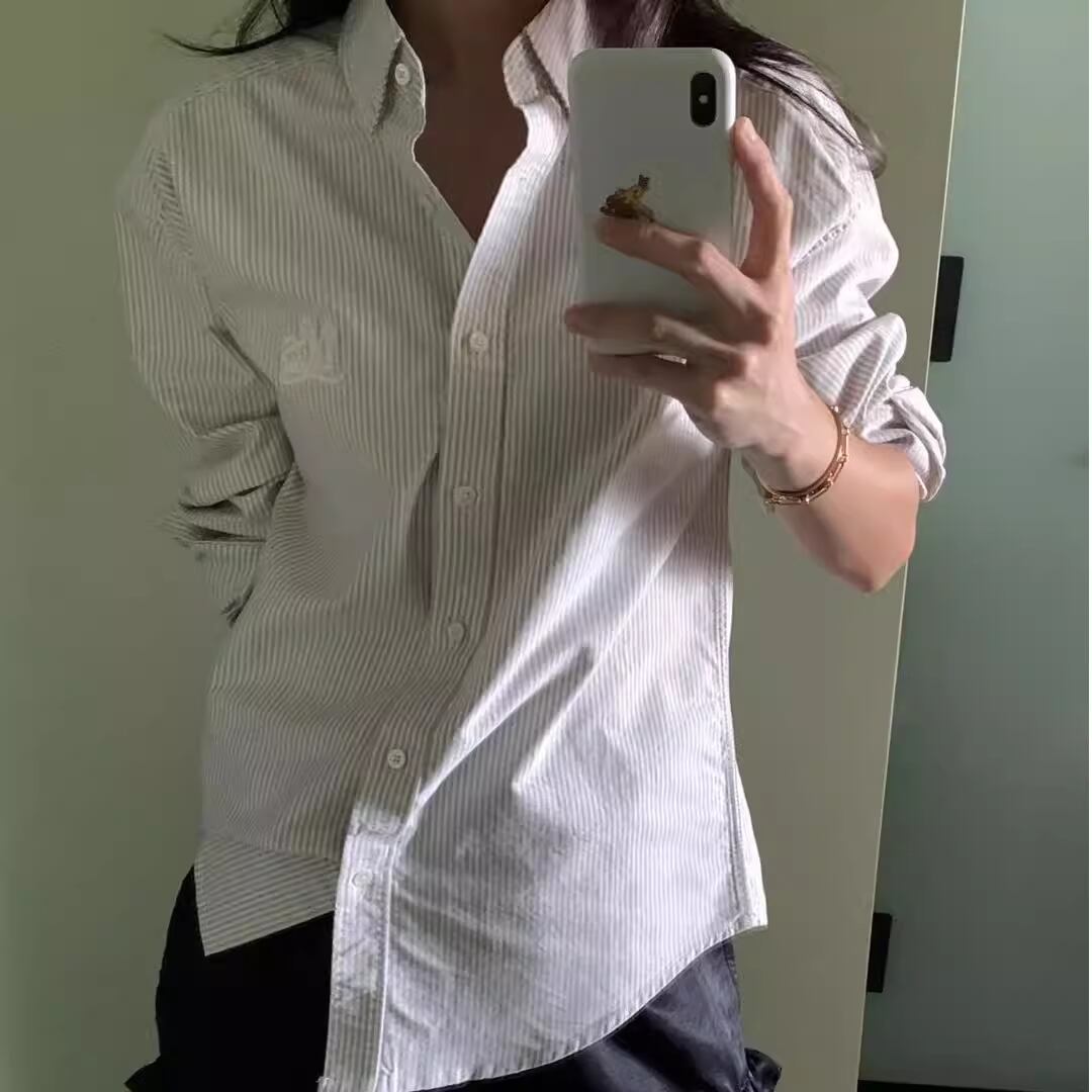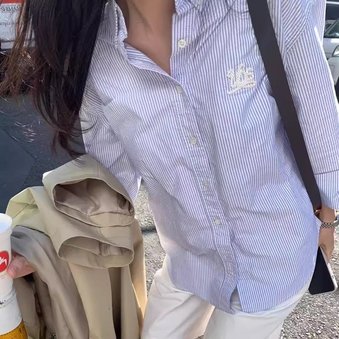 2025年韓国風デザイン、綿100%素材に繊細な立体刺繍とクラシックなストライプをあしらった、詩的で洗練された印象のシャツです。