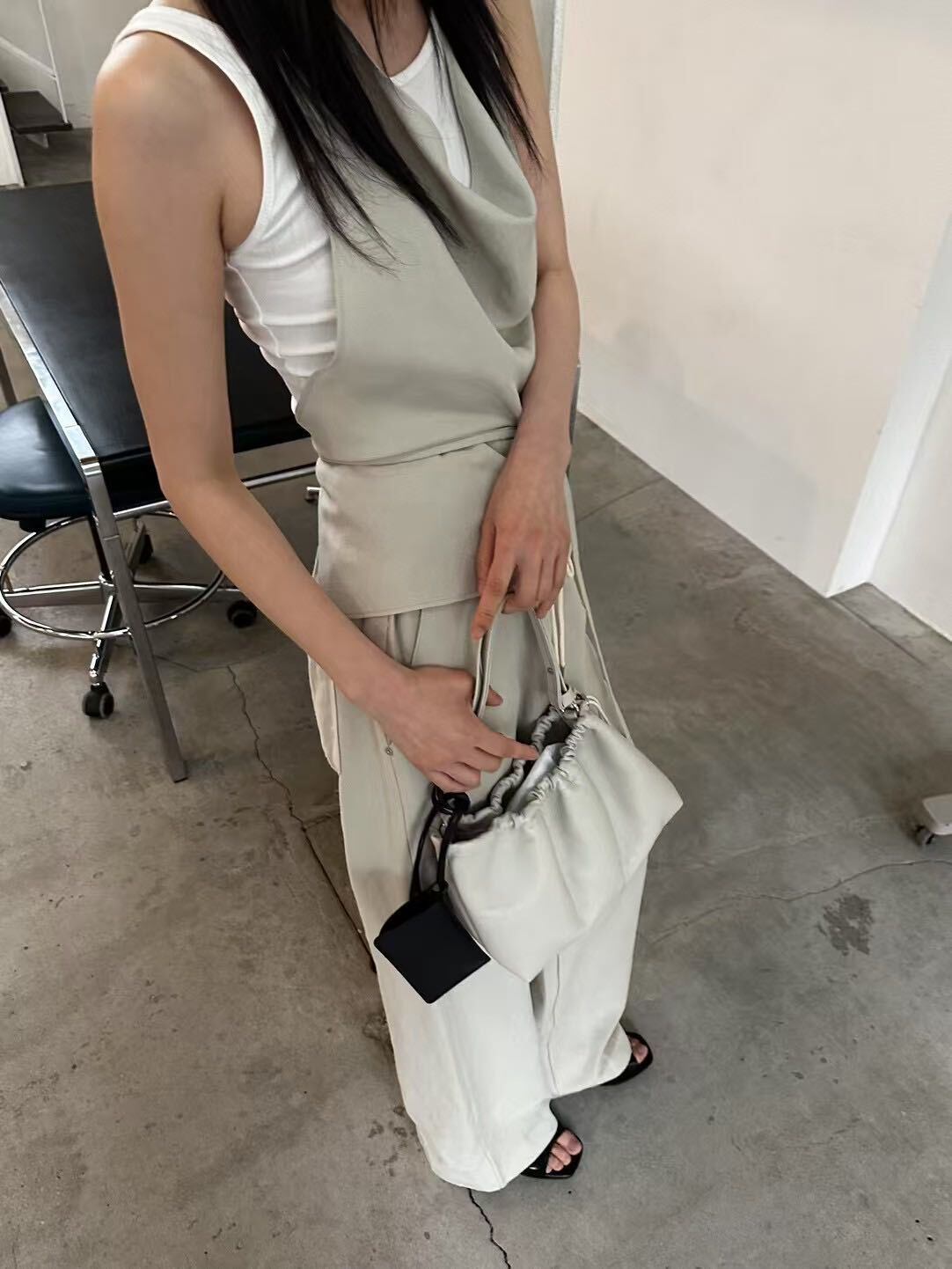 このセットは、ドレープされたホルターネックデザインがリラックスしたパンツに流れ込むスタイルで、快適さとスタイリッシュさを完璧に組み合わせています。何気ないおしゃれを楽しみたいカジュアルな日にぴったりです。