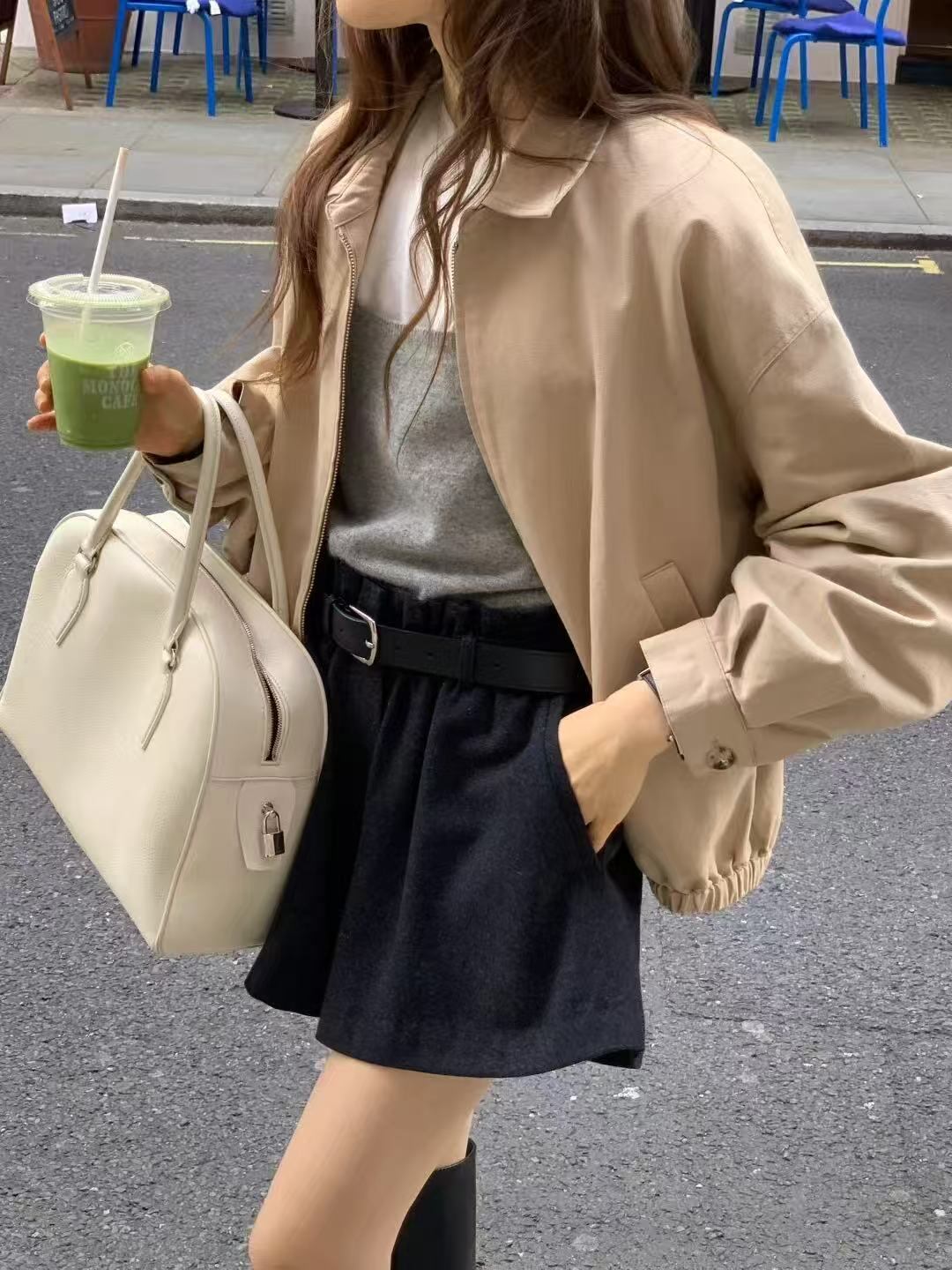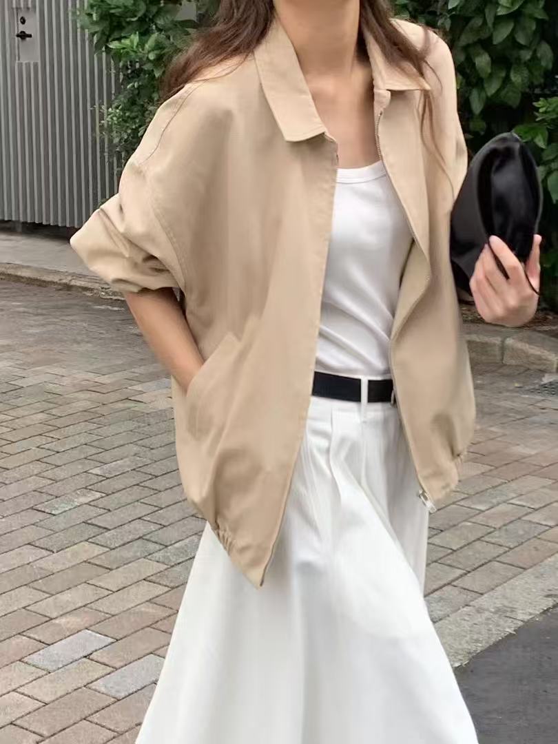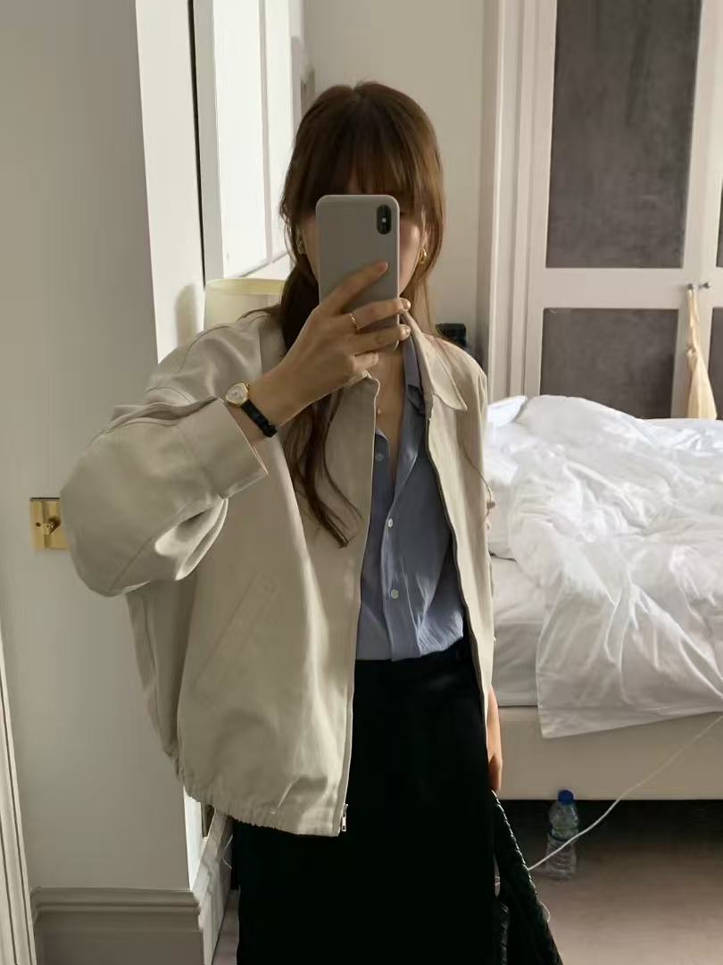 A small-collar zip jacket designed for quiet walks through the city.