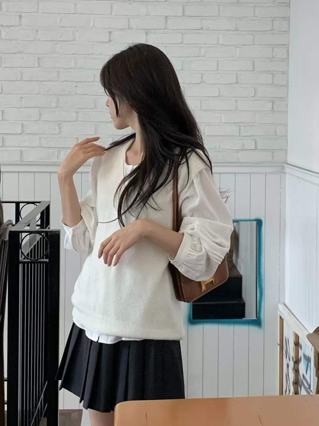 Vネックのニットベスト。柔らかな編み地とシンプルなデザインが、重ね着にも単体でも優雅さを添えます。