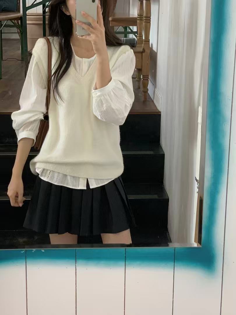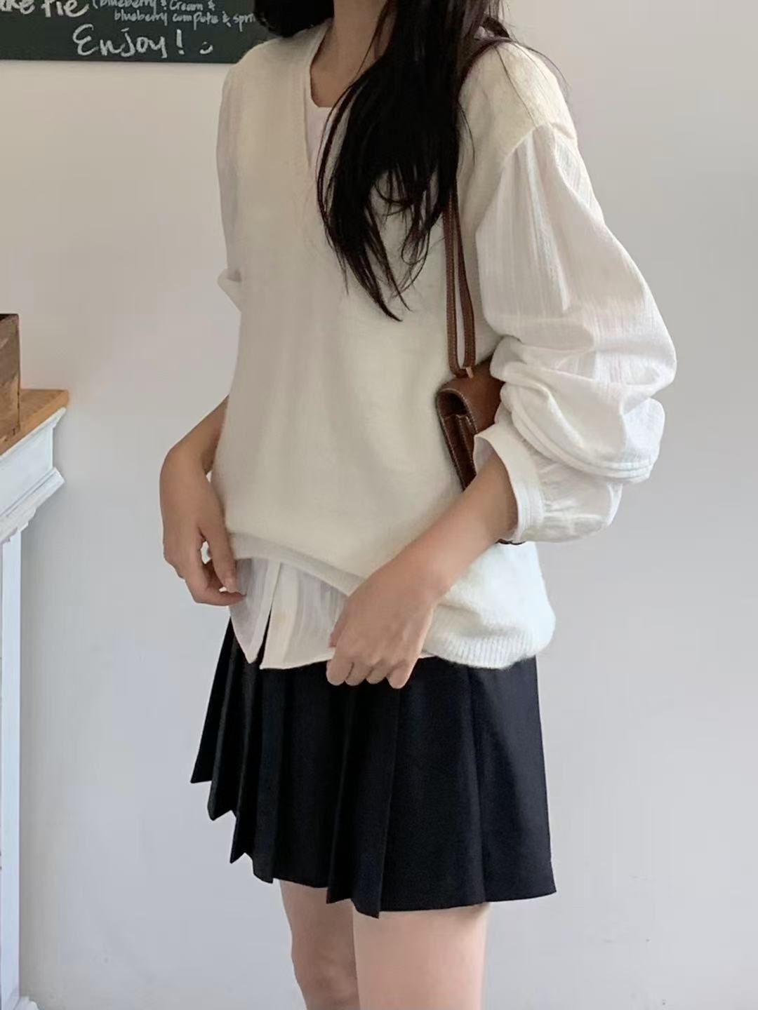A V-neck knitted vest. Its soft texture and simple design add elegance whether worn alone or layered.