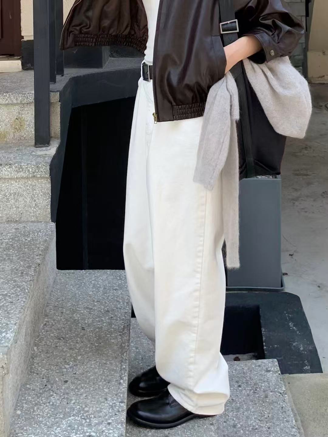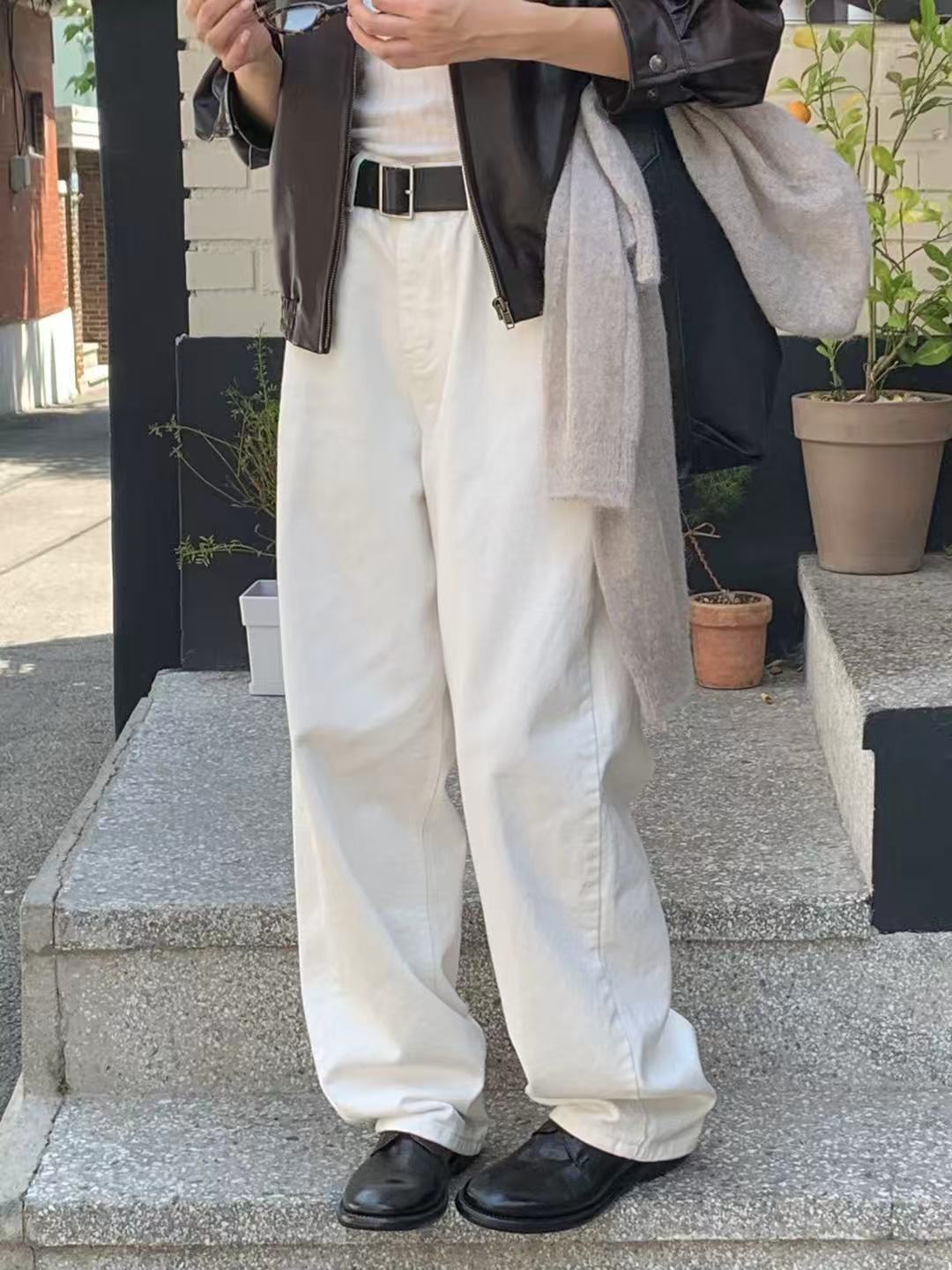 クラシックなブラック&ホワイトのデニムパンツ。シンプルで洗練されたデザインが、日常のスタイルにさりげないアクセントを加えます。