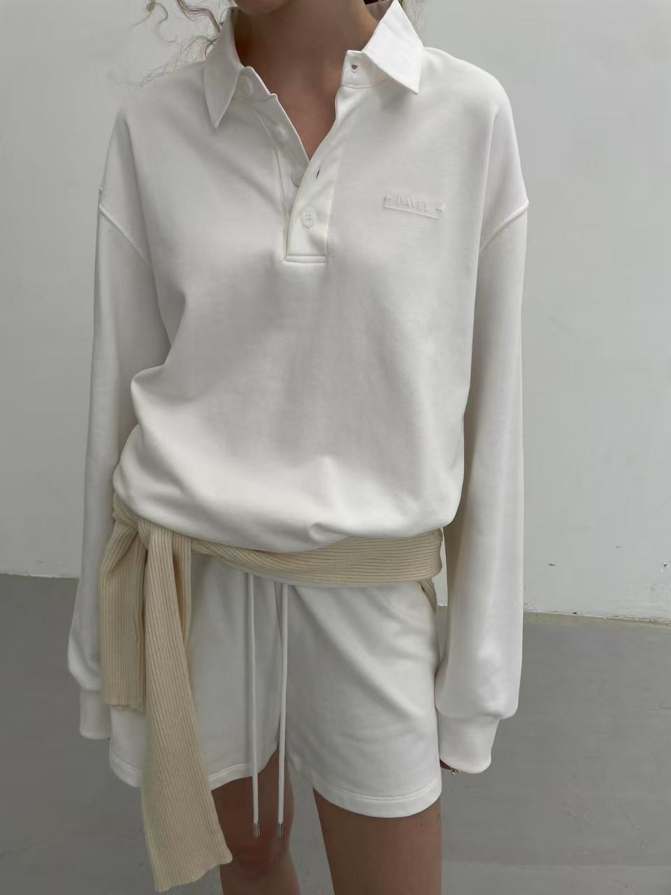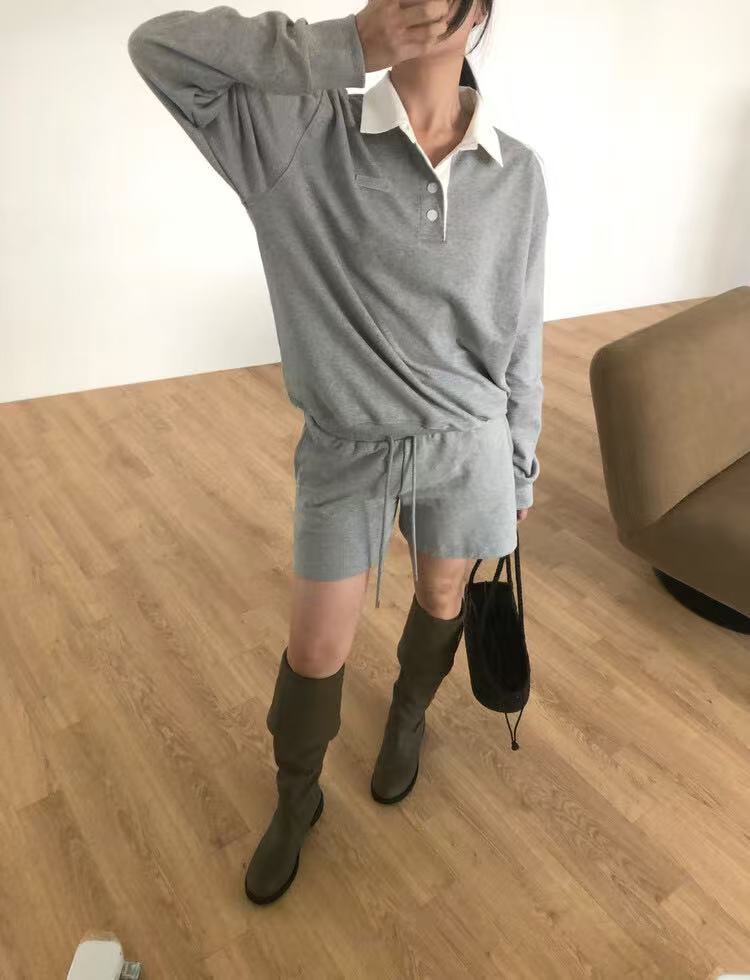 小さな襟が可愛らしいトップスとショートパンツのセットアップ。