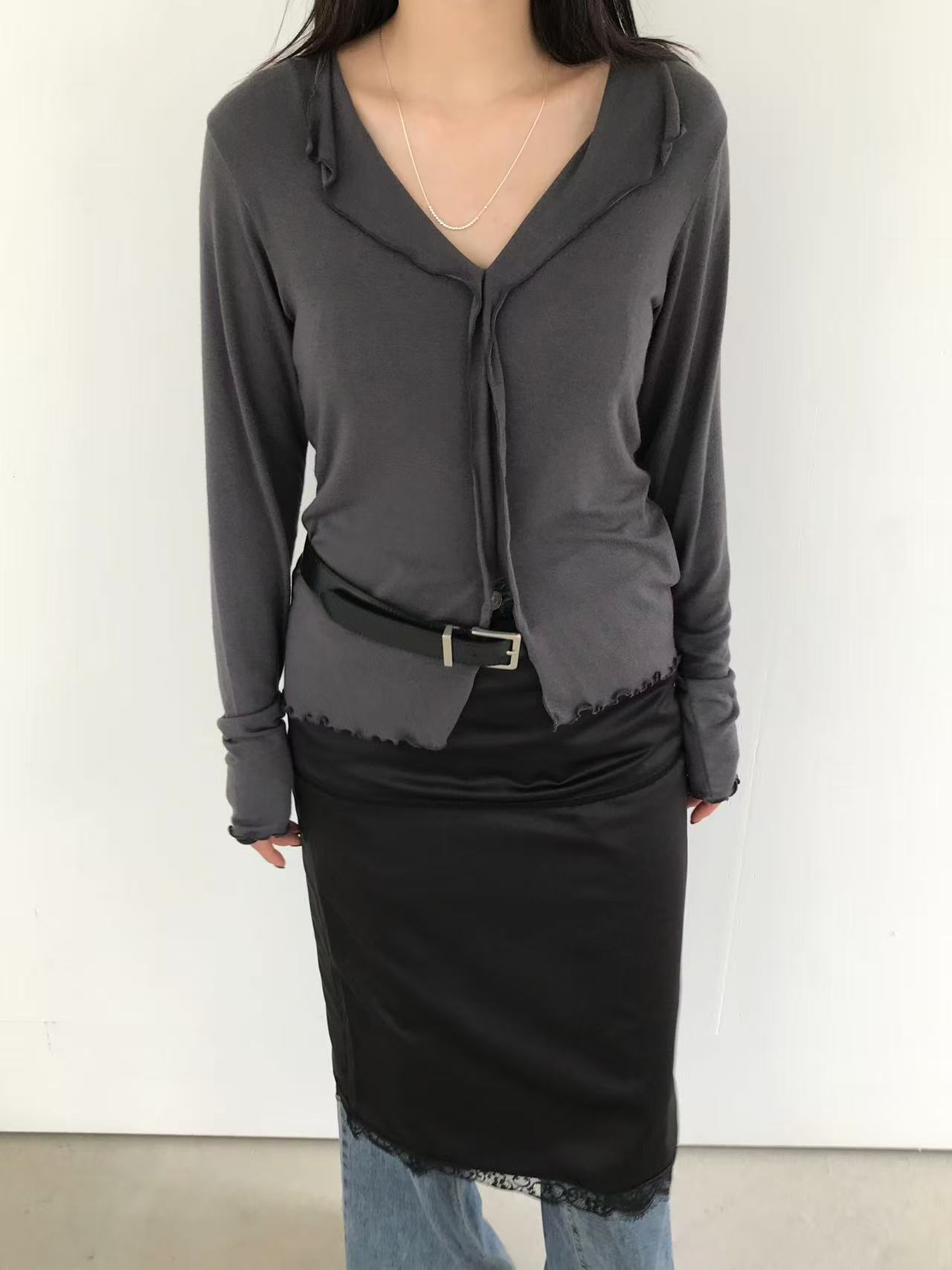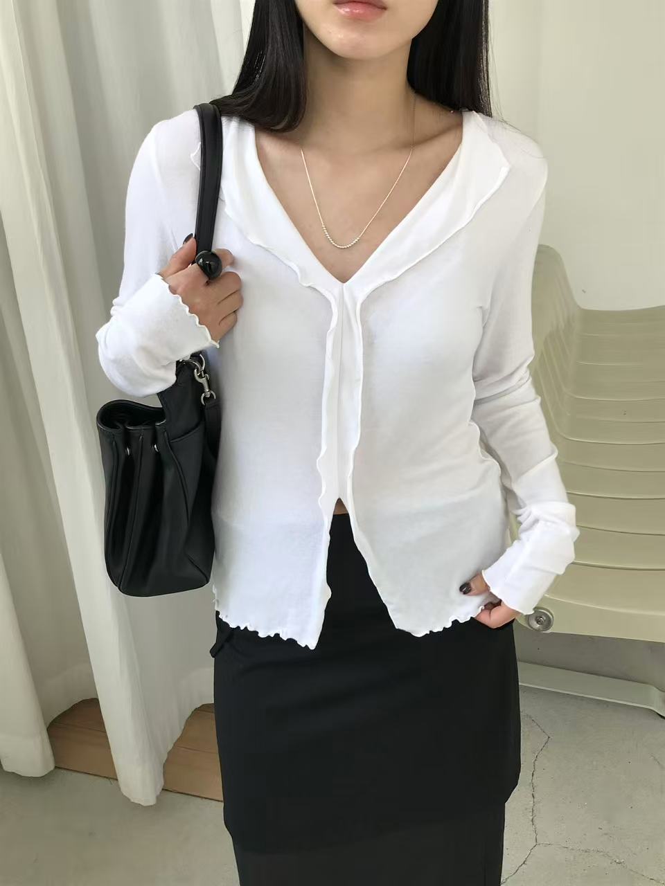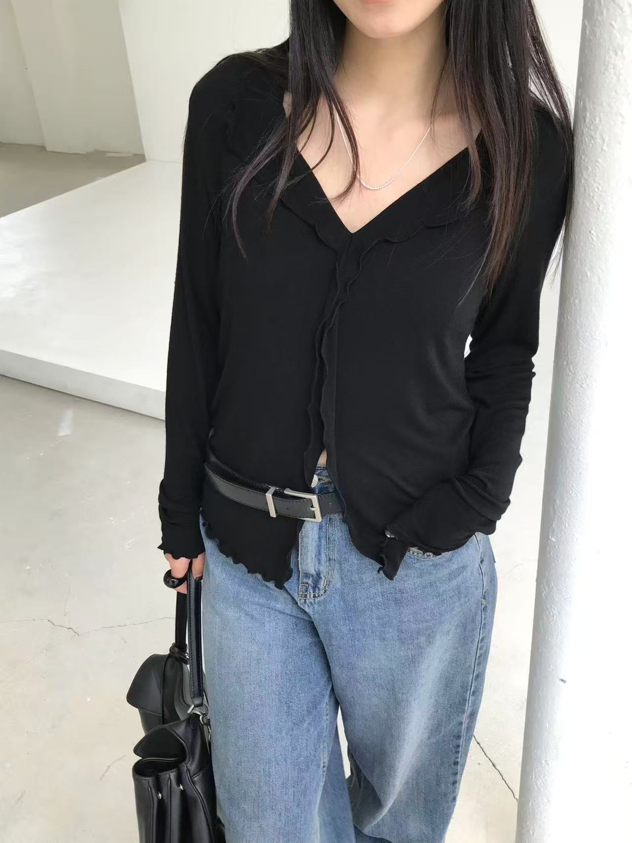フリル付きのデザインブラウス。