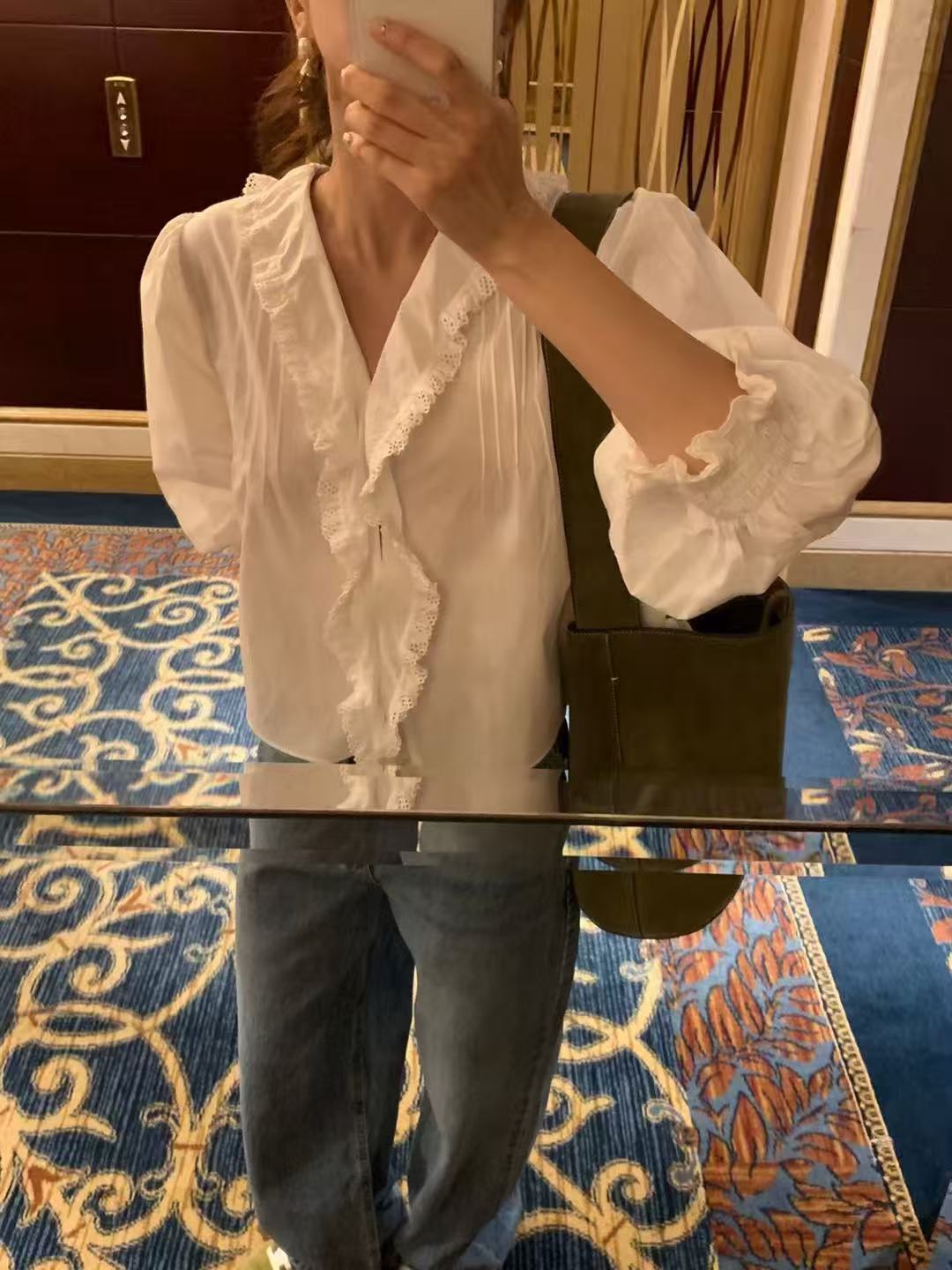 A blouse featuring a ruffled neckline.