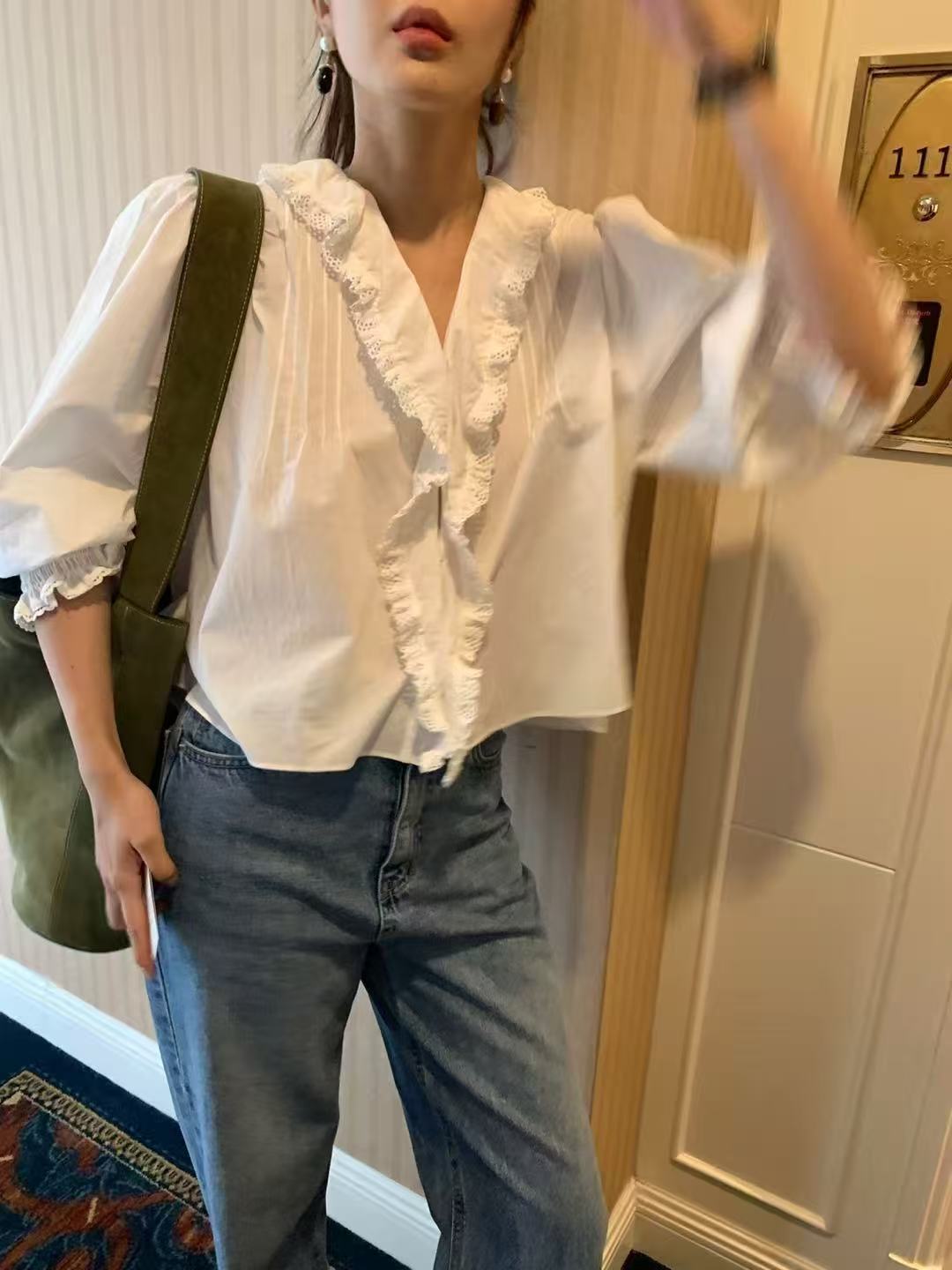 襟元にフリルのあるブラウス。