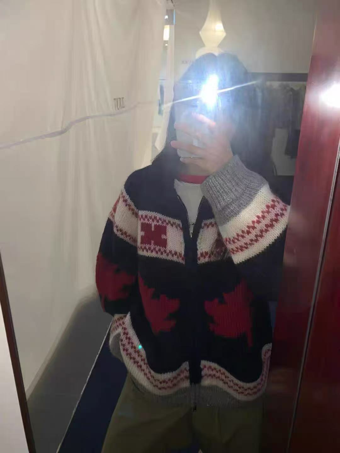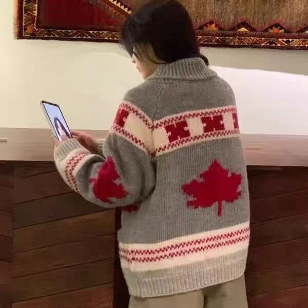 A zip-up cardigan featuring jacquard patterns inspired by maple leaves. Soft texture and muted tones create a warmth that blends seamlessly with the autumn air.