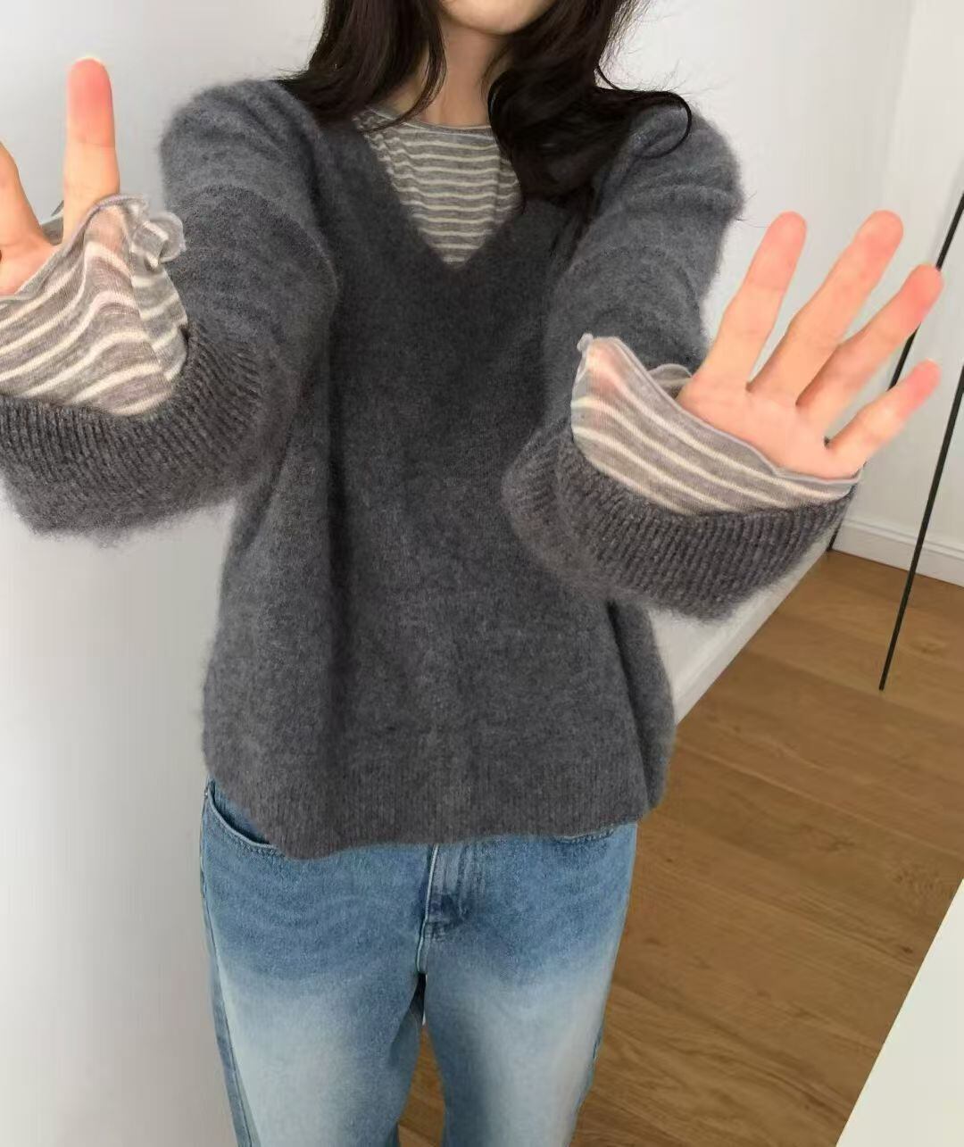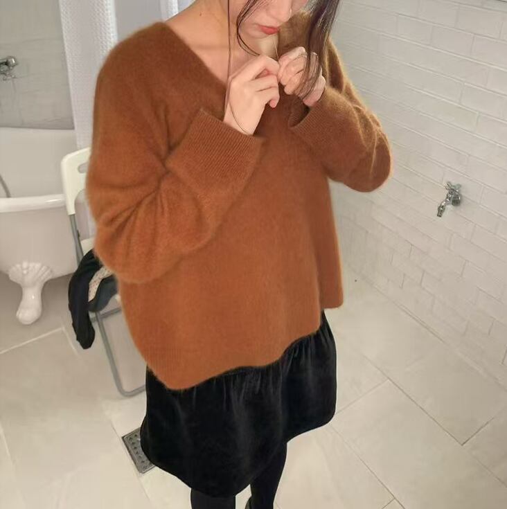 カシミヤとメリノウールを贅沢に使用したVネックセーター。極上の柔らかさが肌に寄り添い、軽やかで温かみのある着心地を提供します。