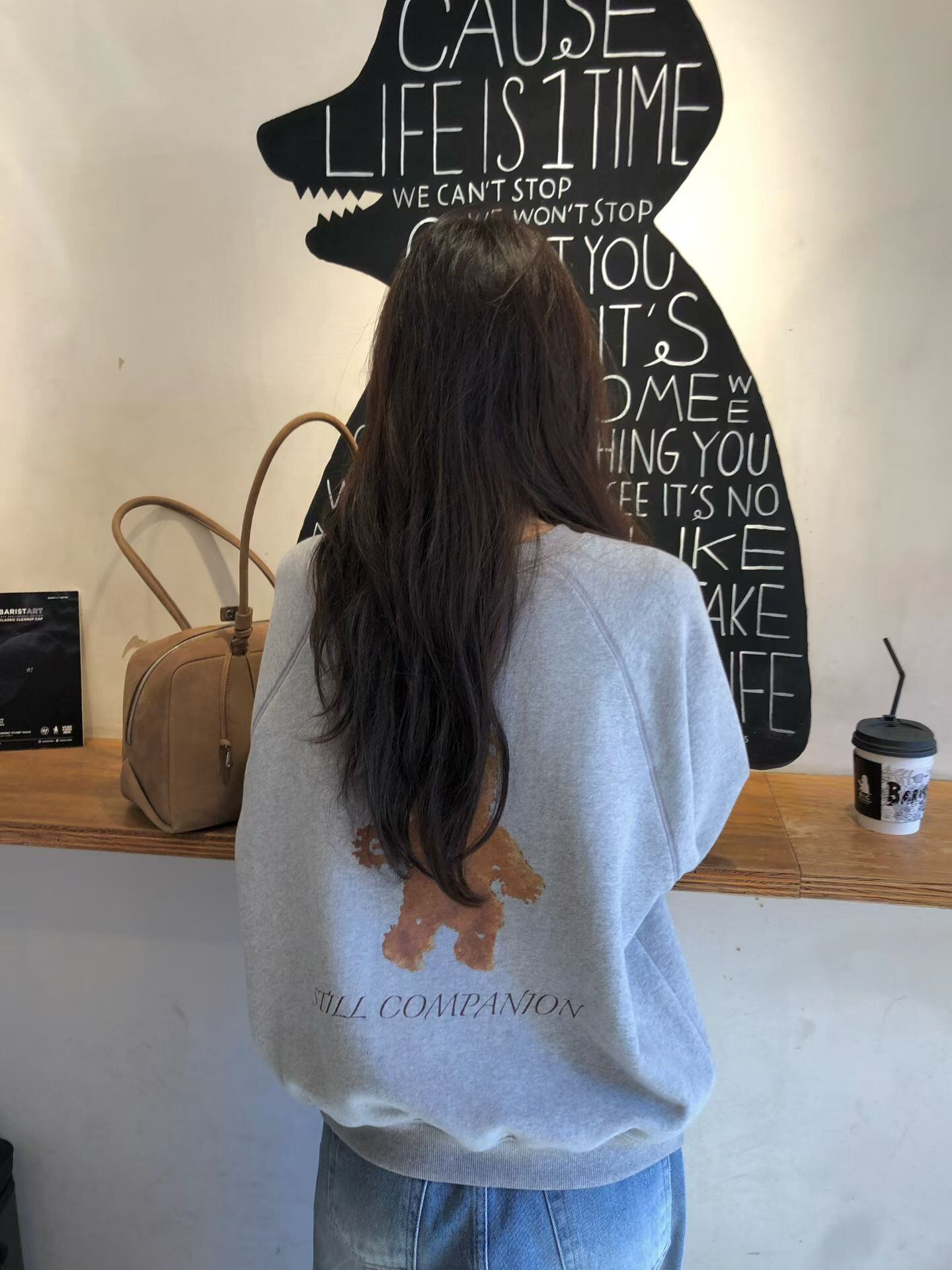A sweatshirt with a subtle bear print on the back.