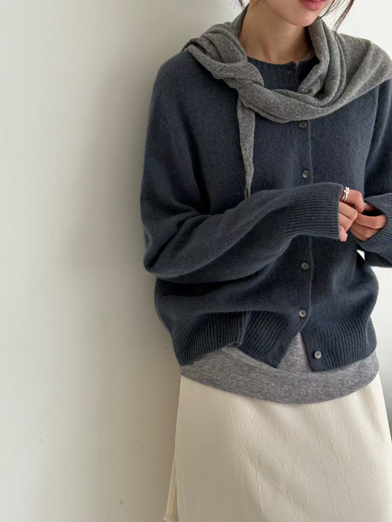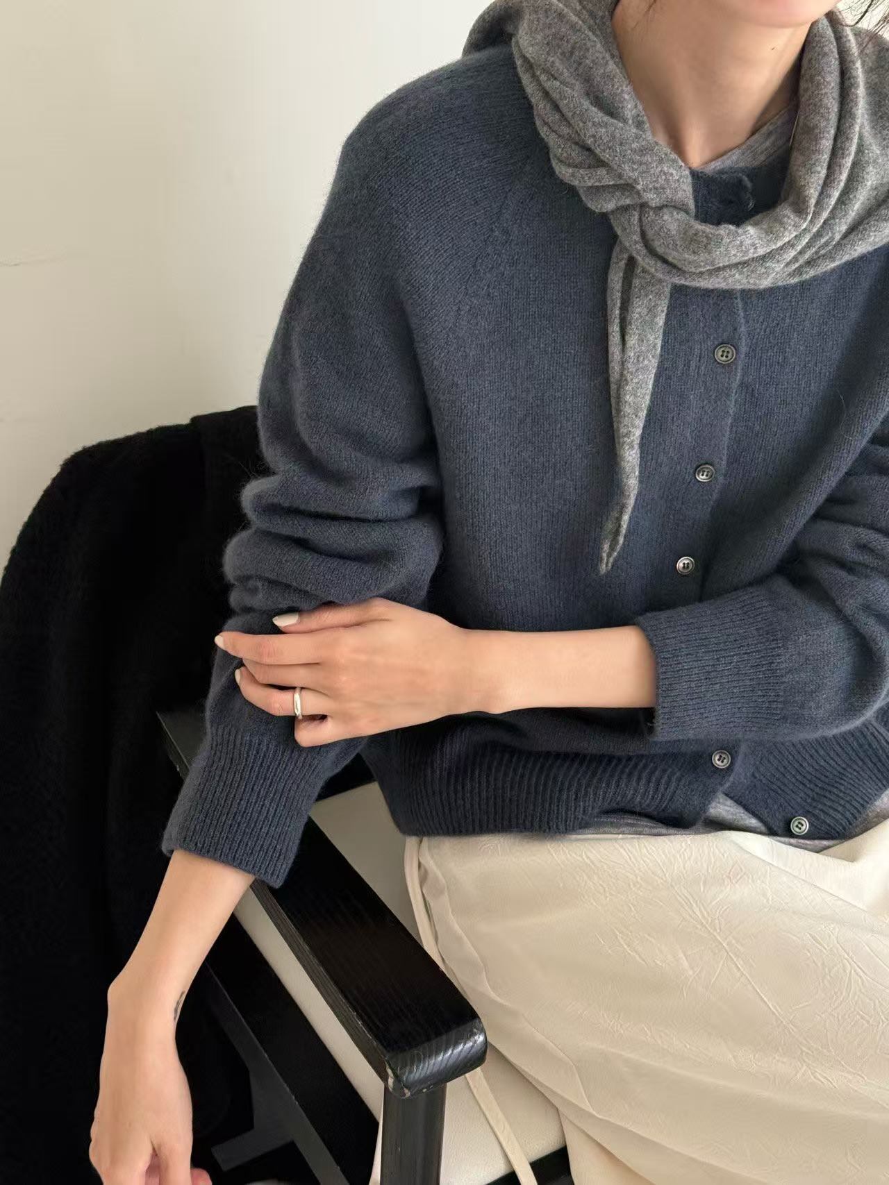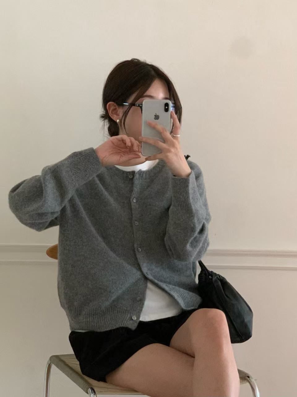 一枚仕立てで編まれたシンプルなニットカーディガン。継ぎ目のない滑らかな着心地が、軽やかで上品な印象を与えます。
