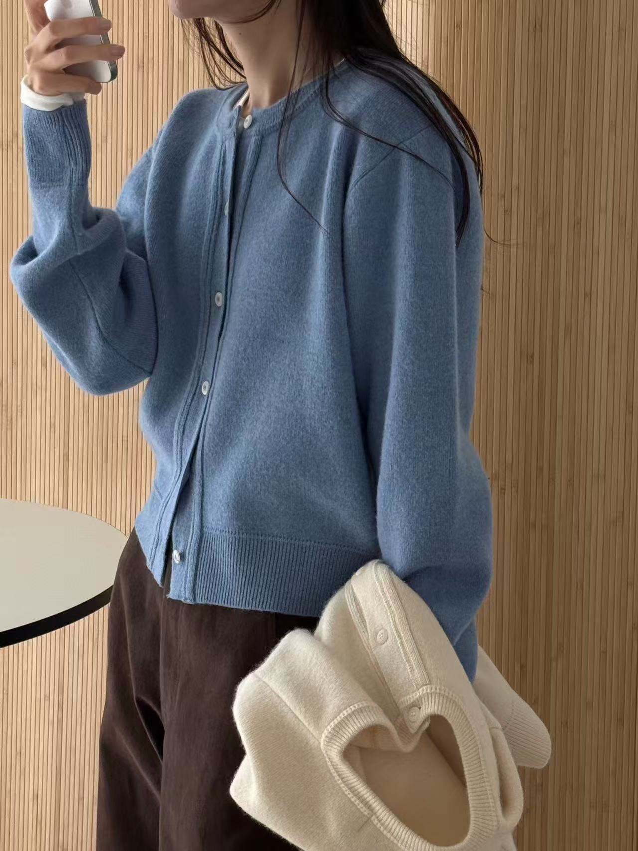 カシミヤとウールを使用した柔らかなニットカーディガン。肌に優しく寄り添い、軽やかで温かみのある着心地を提供します。