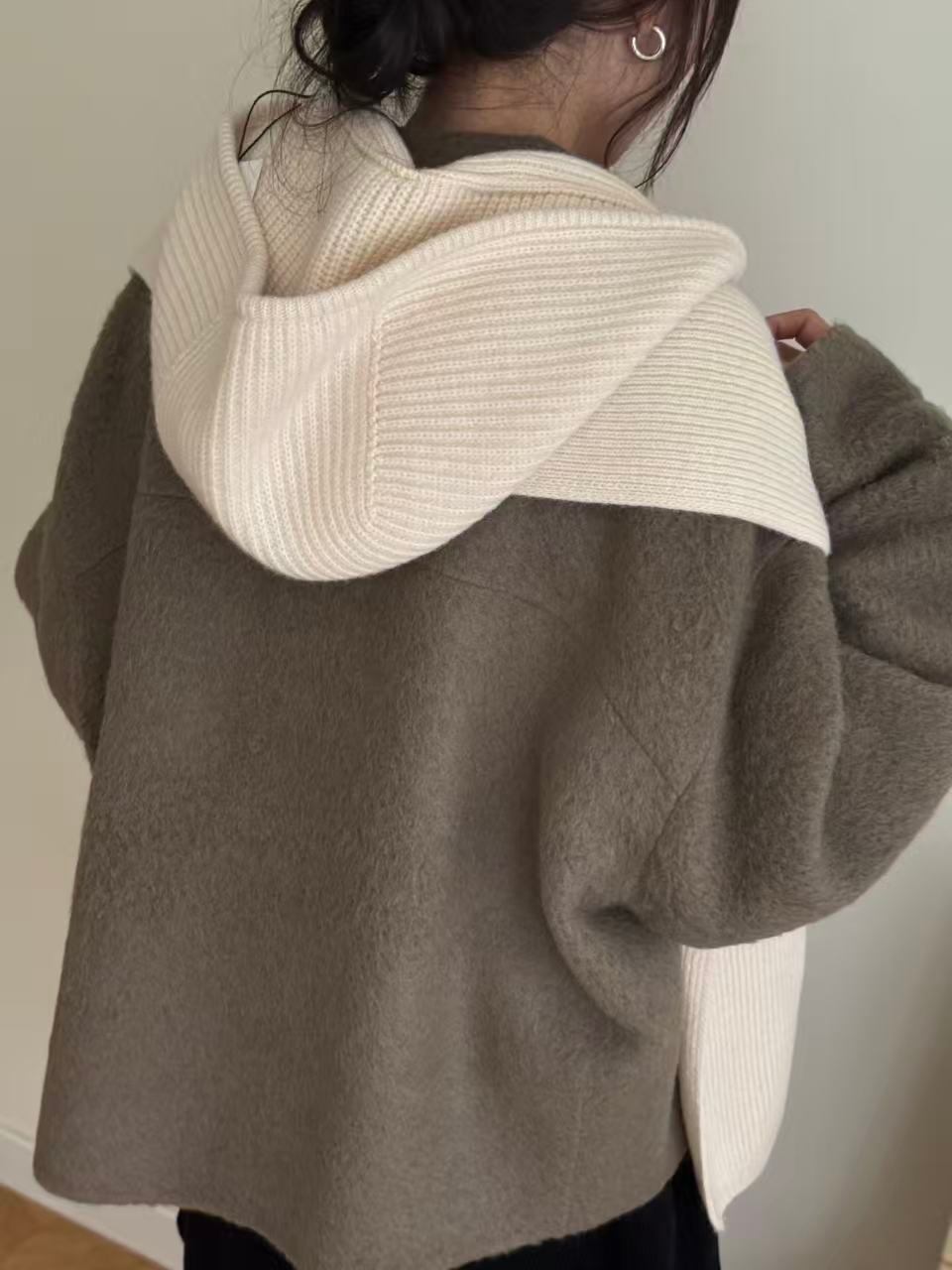 柔らかなニットで作られたショール兼帽子。軽やかで暖かく、冬の装いに優しいアクセントを添えます。