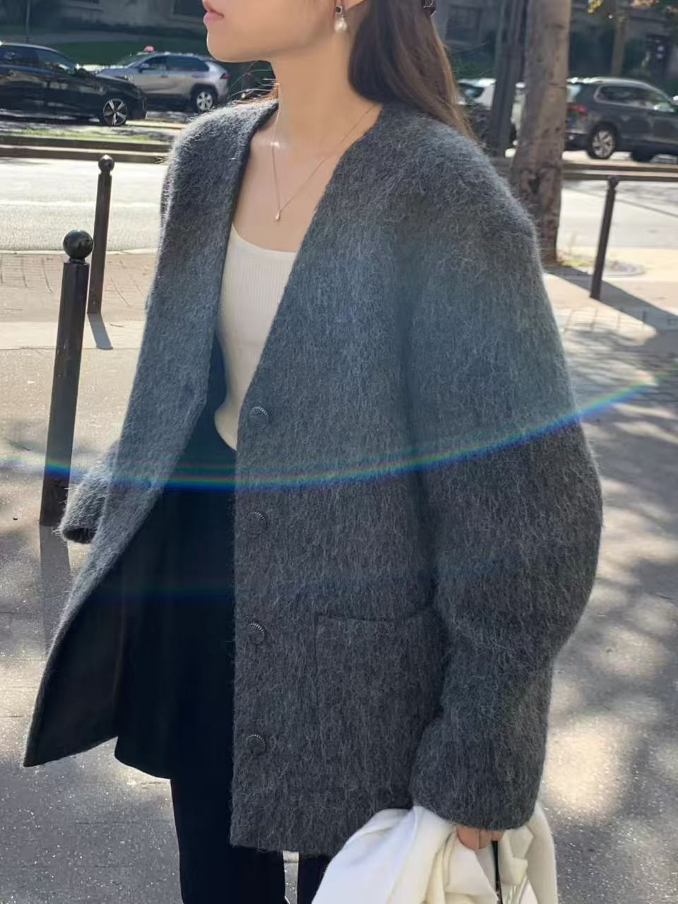 柔らかな素材で仕立てたVネックジャケット。 シンプルな中に清楚さと品の良さが漂い、秋冬の装いに静かな温もりを添えます。 軽やかなシルエットが身体に優しく馴染み、どんな日常にも穏やかな詩情を感じさせる一枚です。