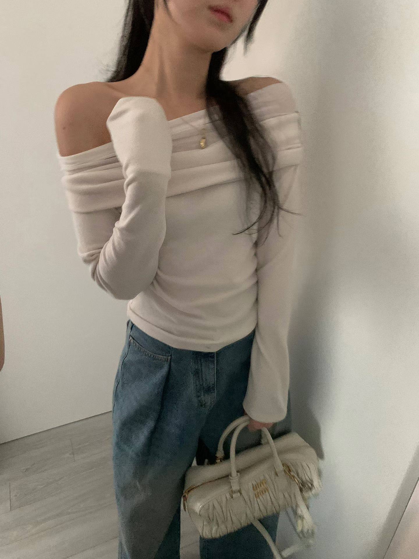 韓国製の人気オフショルダートップス。肩や鎖骨部分にシアー素材をあしらい、大人っぽく清楚な印象。